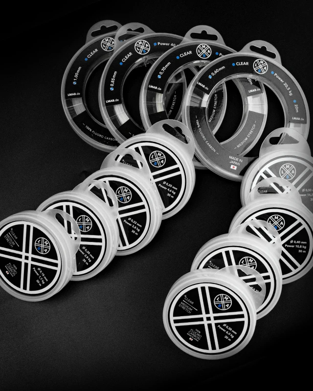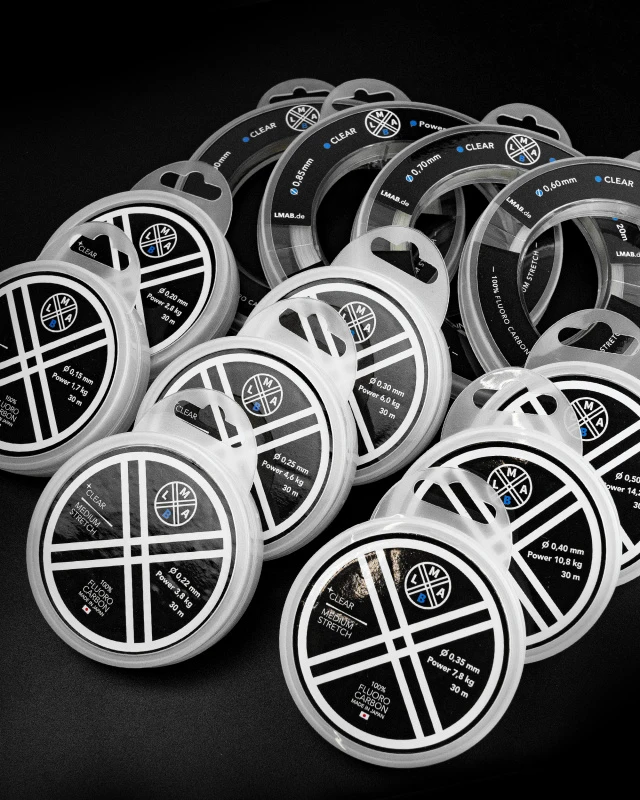 Im Zeitalter der geflochtenen Schnüre führt kein Weg an gutem Fluorocarbon vorbei. Als Vorfachmaterial ist dies zwingend notwendig, um die empfindlichen Geflechtschnüre vor Schnurbruch zu schützen. Dabei sind die Qualitäten durchaus unterschiedlich. Das neue #LMAB-Fluorocarbon ist eine Vorfachschnur aus 100% Fluorocarbon, auf die man sich verlassen kann. Der Lichtbrechungsindex ist sehr nahe dessen von Wasser, weshalb das Material unter Wasser kau sichtbar ist. Die Abriebfestigkeit ist enorm hoch, sodass es auch in hängerträchtige Bereichen, wie an Muschelbänken oder in Hafengebieten bedenkenlos zum Einsatz kommen kann. Vom feinsten Faden für , bis zum bissfesten Hechtvorfach ist jede Stärke lieferbar. Die Knotentragkräfte sind durch die Bank hoch und das Material eine gelungene Komposition aus Knotbarkeit und Festigkeit. Die dehnungsoptimierte Vorfachschnur stellt besten Kontakt zum Köder her und hat dennoch in der Endphase des Drills eine gewisse Restdehnung als Puffer. Made in Japan und auf Spulen mit großem Durchmesser geliefert, findet jeder Raubfischangler sein optimales Raubfischvorfach.Made in Japan100% FluorocarbonSpule mit großem DurchmesserOptimierte DehnungHohe Abriebfestigkeit